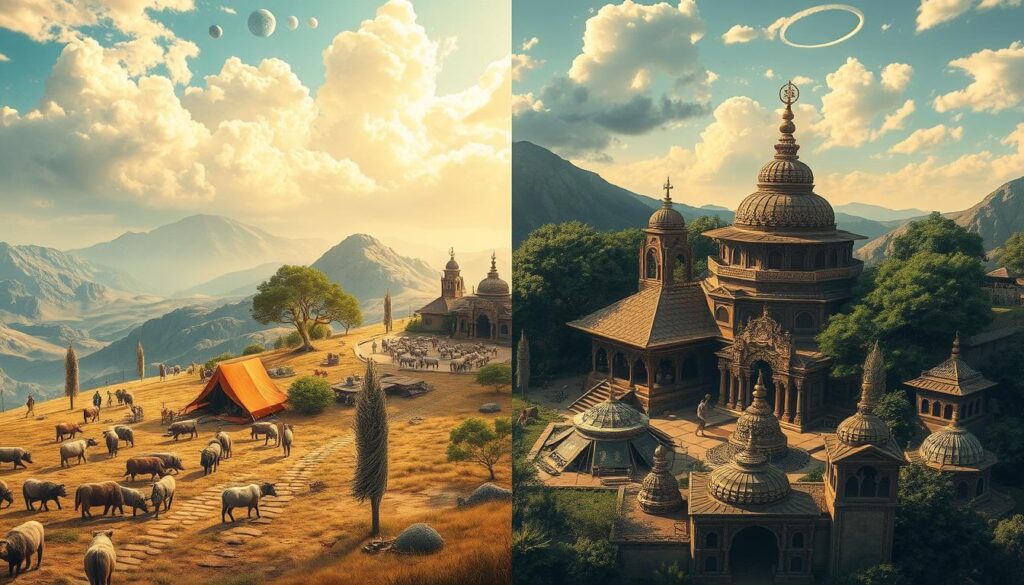 Göçebe ve yerleşik toplumlar, dini inançlarda önemli farklar gösterir. Göçebe toplumlar, doğa ve hayvan sembollerini daha fazla kullanır. Yerleşik toplumlar ise, düzenli ibadet ve sabit tapınaklar üzerine yoğunlaşır.